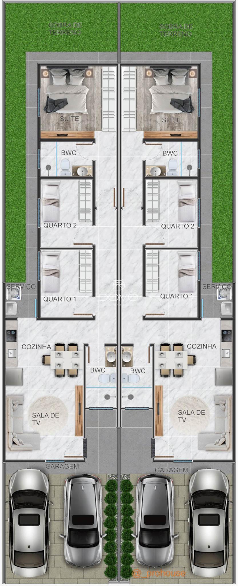 A residência possui 1 suíte, 2 quartos, sala de estar, cozinha, banheiro social e área de serviço, com ambientes bem distribuídos e excelente aproveitamento dos espaços. Conta ainda com 2 vagas de garagem descobertas.