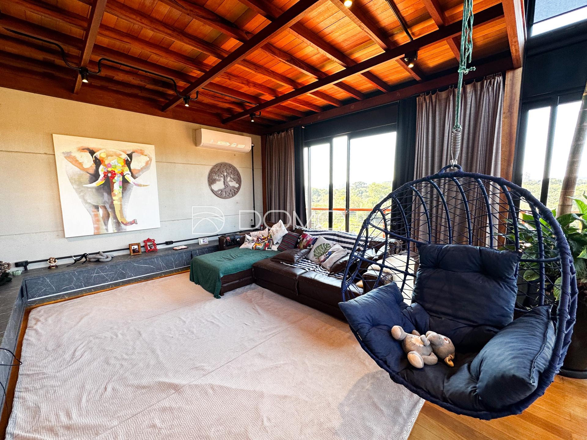 A sala principal apresenta um pé direito duplo, proporcionando uma sensação de amplitude e luminosidade ao ambiente. Esse espaço oferece uma atmosfera acolhedora, perfeita para reunir a família e amigos ao redor de uma lareira aconchegante nos dias mais frios.